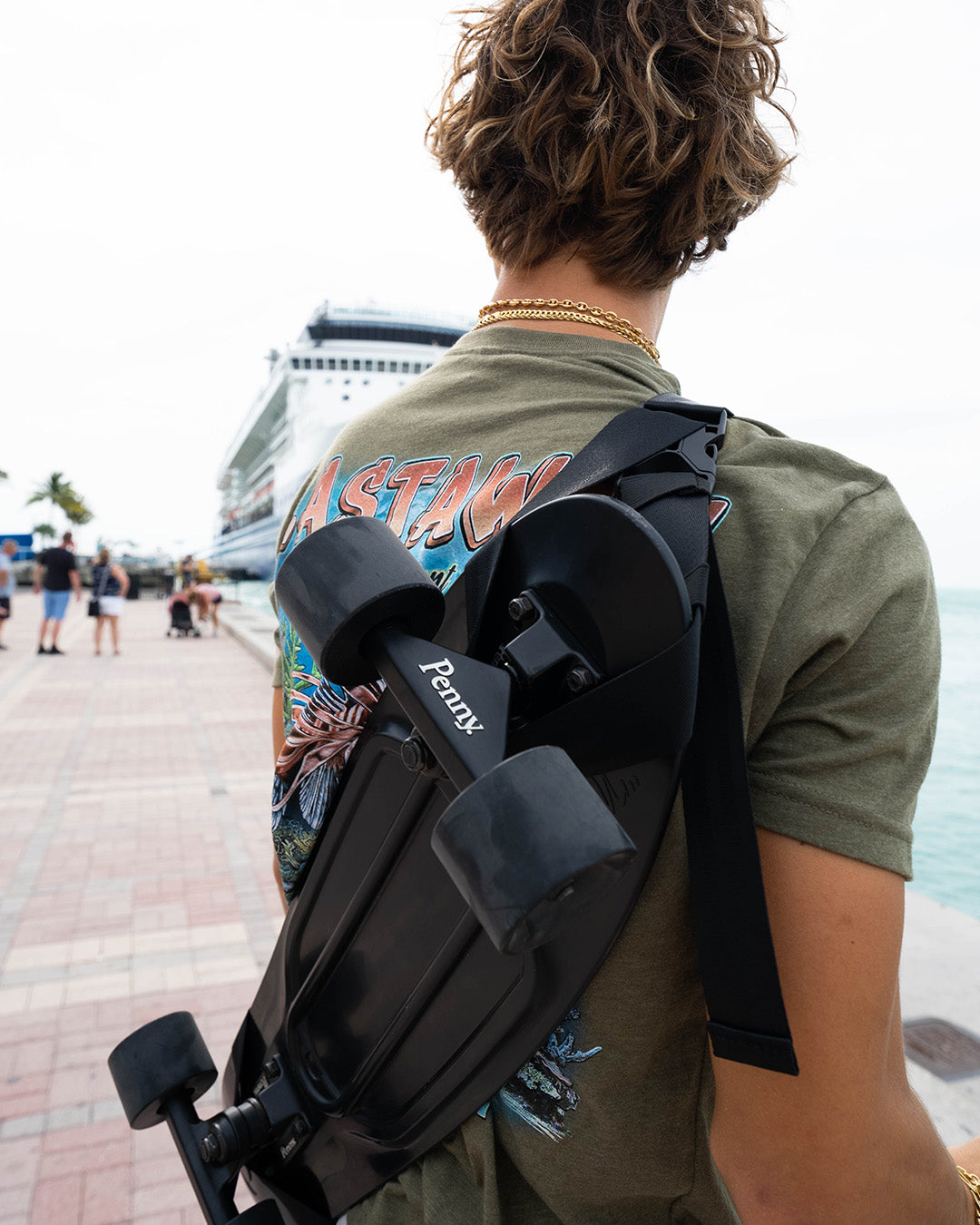After testing many variations of the skate sling, a solution was found, using the two clip system, for a sleek and comfortable carry bag, great for wearing both with and without a skateboard.